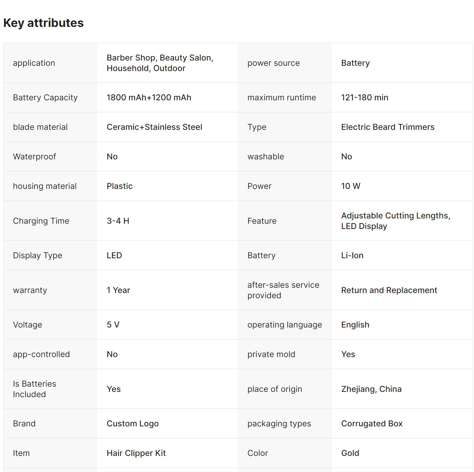 2000mAh Lithium Battery Professional Wholesale OEM Factory Quality USB Rechargeable Hair Salon Accessories Men's Beard Hair Clipper Trimmer SetQuality USB Rechargeable Barber Shop Accessories Men's Beard Hair Trimmer Set